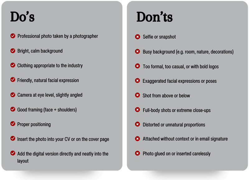 There are no strict rules about how your application photo must look — but it should always be professional, authentic, and appropriate for the position you're applying for. A good photo doesn’t just look neat — it also says something about you. To truly make an impression, pay attention to the following: